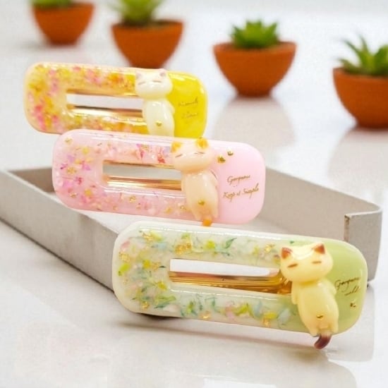 愛らしい猫ちゃんとスイーツをモチーフにした、視覚をも楽しませてくれるヘアクリップです。