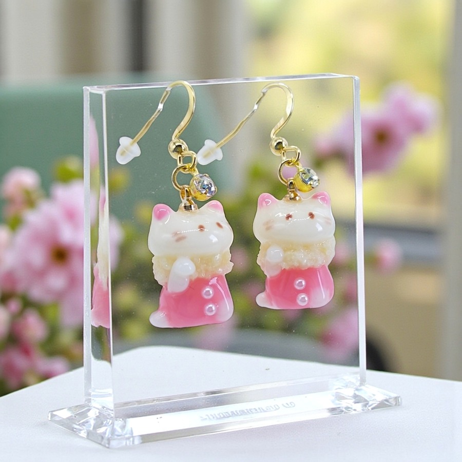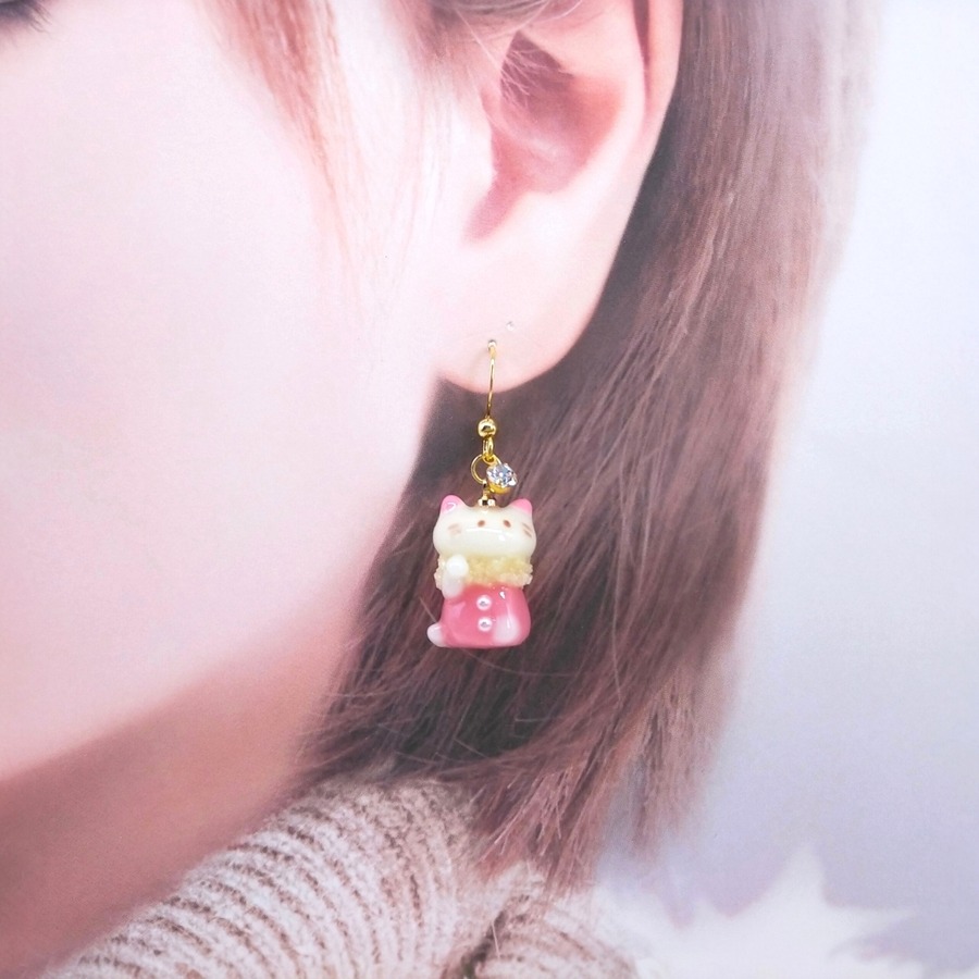 招き猫ちゃんは、幸福や繁栄を象徴しています。柔らかな色合いと丸みを帯びたフォルムが、耳元を可愛く彩ります。