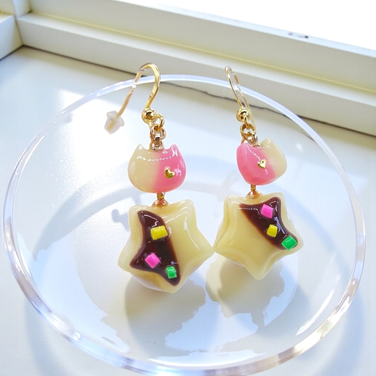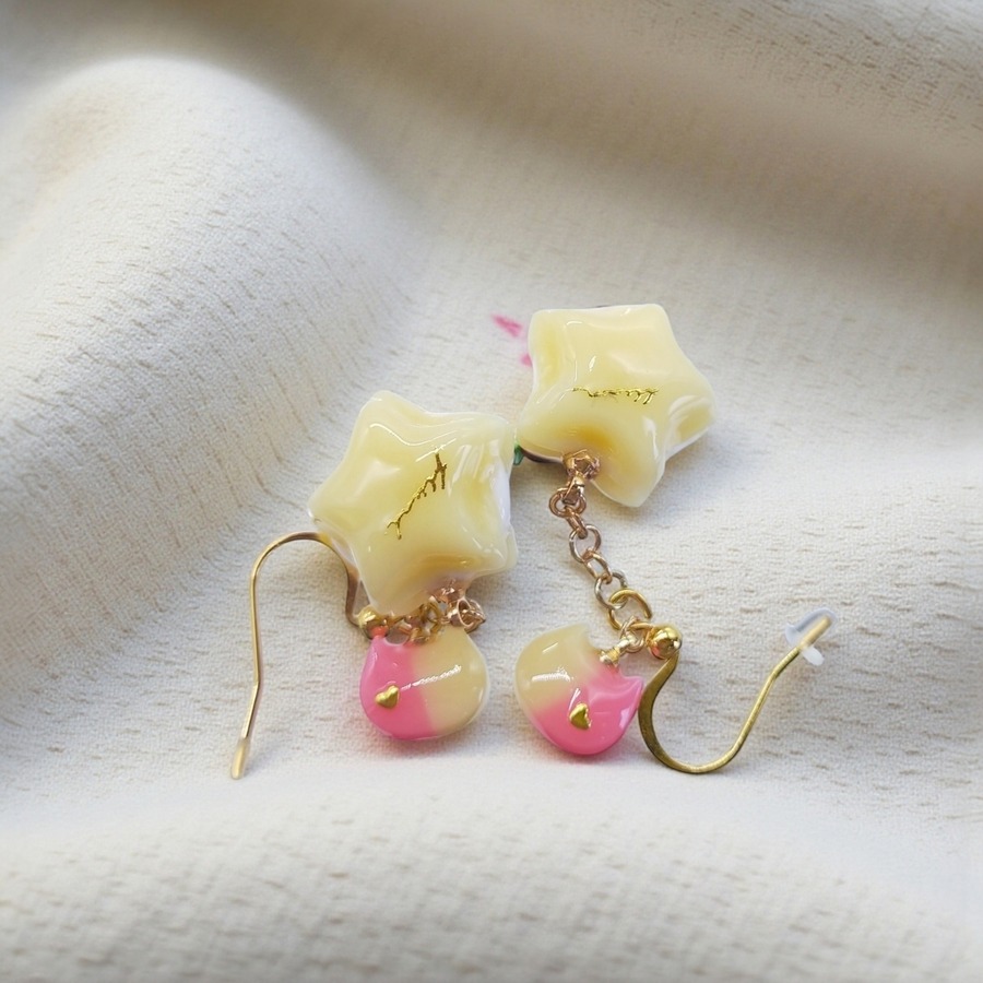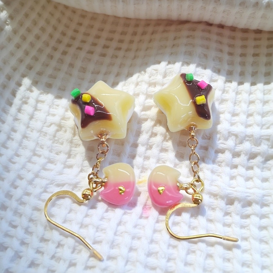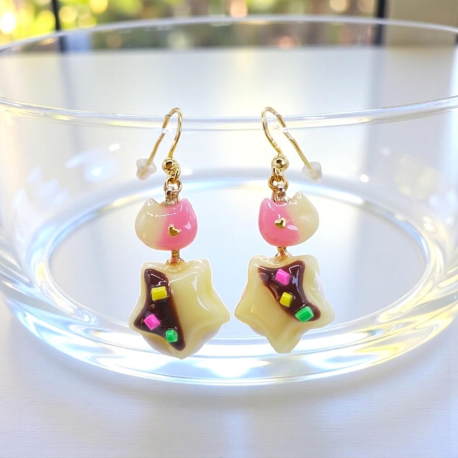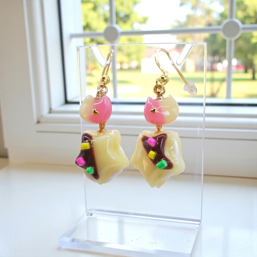見た目にも美味しそうな星形のクリームサンドと、愛らしい猫ちゃんフェイスが目を引くピアス/イヤリングです。