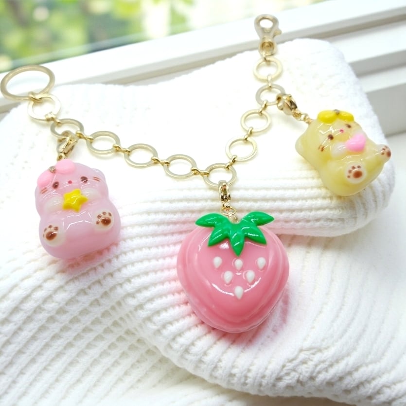 小さなハートと星を抱えた可愛い猫ちゃんと、あま~いイチゴのクリームサンドが付いたバッグチャームです。
